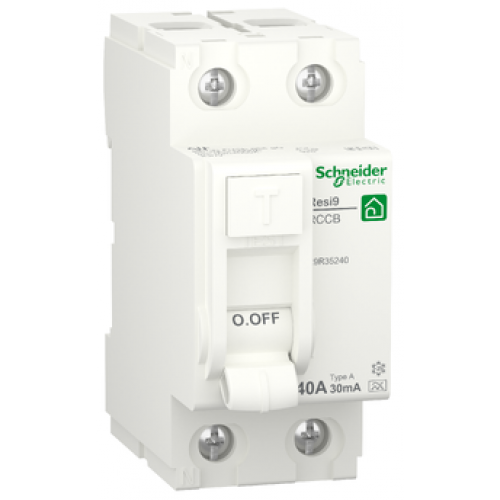 Dit is een Resi9 RCCB aardlekschakelaar (RCCB). Het is een 2P-stroomonderbreker met In-nominale stroom van 40A, klasse A-typebeveiliging en een aardlekgevoeligheid van 30mA. Dit product biedt bescherming tegen elektrische schokken door direct of indirect contact en brandgevaar. Als een uiterst gevoelige aardlekschakelaar wordt deze aanbevolen voor alle stopcontacten. Het is ook verplicht voor alle apparaten in badkamers, buiten. Resi9 is gericht op de woningmarkt voor individuele en collectieve gebouwen. Dit product voldoet aan de norm EN/IEC 61008-2-1. De voorwaardelijke kortsluitstroom (Inc/c) heeft een waarde van 6000 A. De nominale (Im/m) sluit- en kortsluitcapaciteit is 500 A. De elektrische levensduur bedraagt 10000 cycli. De mechanische levensduur bedraagt maximaal 20000 cycli. De bedrijfsspanning van de UPS is 230 VAC. Het is een DIN-rail monteerbaar. De breedte in 9 mm standen is 4. De kleur van het product is wit (RAL9003). De afmetingen zijn (B) 36mm x (H) 81mm x (D) 73mm. Het heeft een IP20 beschermingsgraad. Het wordt IP40 eenmaal in modulaire behuizing volgens de IEC/EN 60529-norm. De bedrijfstemperatuur is van -25°C tot 40°C. De bewaartemperatuur bedraagt -40°C tot 80°C.