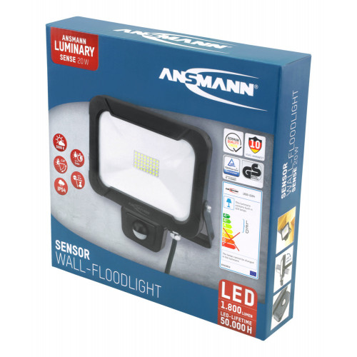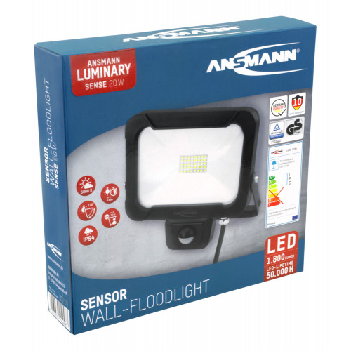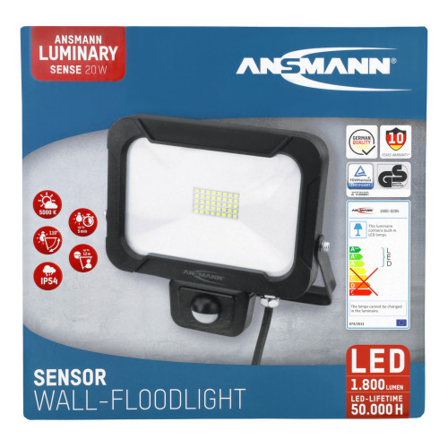 Robuuste en compacte ANSMANN Luminary sense-lamp voor wandmontage met 20W SMD LED's en een lichtsterkte tot 1600lm; stof- en spatwaterdicht dankzij IP54 (geschikt voor buitengebruik); aangenaam licht met een kleurtemperatuur van 5000K (daglicht); hoek van de spot verticaal 190° instelbaar; geïntegreerde bewegingsmelder met een detectiebereik tot 12m en een detectiehoek van 180° horizontaal en 90° verticaal; instelbare lichtintensiteit; instelbare lichtduur van ca. 10 sec tot 10 min; 10 jaar garantie.