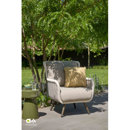 Het stevige frame is gemaakt van aluminium in de kleur Bronze en wordt gecombineerd met handgevlochten wicker in de kleur Ivory, wat de stoel een warme en natuurlijke uitstraling geeft. De stoel is uitgerust met de luxe Bee Wett kussens in Bouclé Taupe, die extra comfort bieden en uitnodigen om te ontspannen, of u nu een boek leest of geniet van een zonnige dag.
