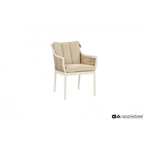 De stoel is voorzien van een hoogwaardig Bee Wett® all-weather kussen in de tint Cotton Flower, dat waterafstotend, UV-bestendig en sneldrogend is. Dankzij de ergonomische vormgeving, met perfecte zithoogte en armleuningen, biedt de stoel zowel ondersteuning als comfort, ook bij langere diners of langere zitmomenten.