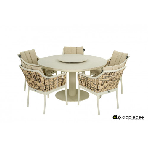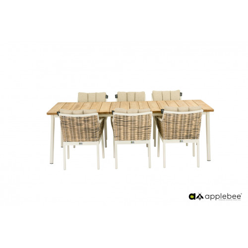De Milou Oyster diningstoel van Apple Bee combineert verfijning met buitengewone comfort en duurzaamheid. Het frame is vervaardigd uit gepoedercoat aluminium in de zachte Oyster-kleur, dat niet alleen een tijdloze en elegante uitstraling biedt, maar ook bestand is tegen de elementen. Het rijk gevlochten Biculair® vlechtwerk in de kleur Golden Sand zorgt voor een natuurlijke uitstraling — het ziet eruit als wilgen-vlechtwerk, maar is gemaakt van stevig materiaal dat speciaal ontwikkeld is voor buitengebruik.
