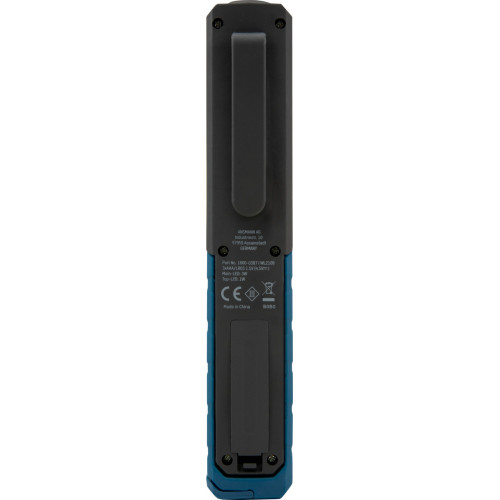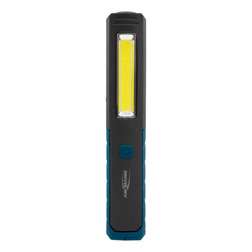 Professionele Werkplaatslamp met 3W COB-LED technologie en extra lampje (1W SMD-LED) op de lampkop, incl. 3x ANSMANN alkaline Micro AAA batterijen; lichtstroom: 210 lm (hoofdlicht), 105 lm (extra licht); brandtijd: ca. 4h (hoofdlicht), ca. 12u (extra licht); bijzonder goed bestand tegen mechanische belasting; heeft een 180° draaibare lampsteel, een uitklapbaar ophangoog, een sterk vasthoudende magneet aan de onderzijde van de steel en een robuuste riemclip; 3 jaar garantie.