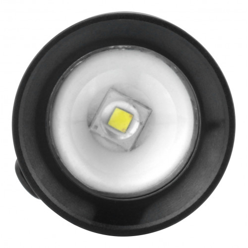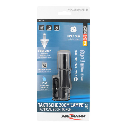 Hoogwaardige 3W-LED aluminium zaklamp, anti-slip oppervlak met maximaal gebruiksgemak; traploze focussering door het bewegen van de lampkop van nauwkeurig puntlicht naar homogeen strijklicht; microcontrollergestuurde tactische eindschakelaar met drie lichtfuncties: 100% / 30% / stroboscoop; helderheid: 115 lumen (100%) / 30 lumen (30%); brandduur: ca. 2,5u (100%) / ca. 5u (30%); lichtbereik: tot 70m; schokbestendig tot 1m valhoogte (beschermingsklasse: IP54), incl. 1x Mignon AA alkaline batterijen, afneembare riemclip en polsriem; 3 jaar garantie.