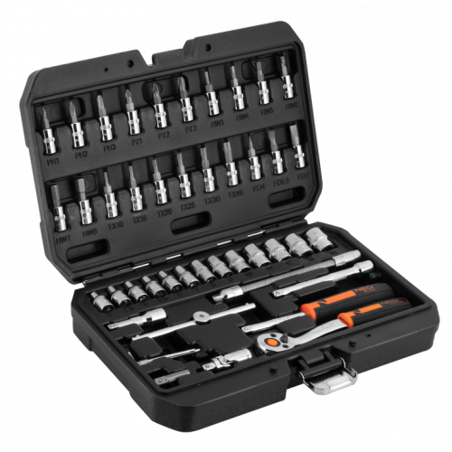 NEO dopsleutelset 1/4" (ref. nr. 10-004) bevat 46 stuks gemaakt van hoogwaardig chroom-vanadiumstaal. De set bevat een ratel met duurzaam ratelmechanisme (90 tanden). De set bevat een breed scala aan dopsleutels (maat 4 tot 14 mm) en aandrijfbits (plat, kruis, zeskant, Torx). Daarnaast is de set uitgerust met verlengstukken (ook flexibel), kruiskoppeling, zeskantdoppen, verschuifbare T-bar en bithouder. Alles in praktische koffer. Productbetrouwbaarheid wordt bevestigd met 25 jaar garantie Het NEO-merk voldoet aan de verwachtingen van professionals.