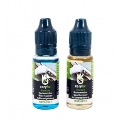 De EAZYFIX® Premium Houtversterker is de voorbehandeling (voorstrijk) van de Houtrotvuller en wordt aangebracht op het hout nadat alle houtrot verwijderd is. Deze vloeistof dringt diep door in de vezels van het hout. Dit versterkt de ondergrond en zorgt voor een optimale hechting met de Houtrotvuller.