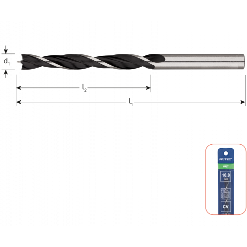 Houtspiraalboor, vervaardigd uit chroom-vanadiumstaal, voorzien van centreerpunt en twee voorsnijders.