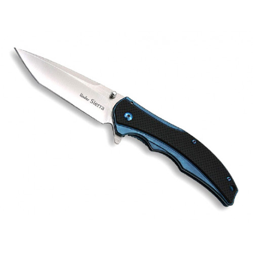 De Linder Sierra is een fraai afgwerkt blauw titan framelock zakmes met carbon fiber accent aan de voorzijde, flipper opening en een modified tanto lemmet. Clip op de achterzijde en koordoog in frame.