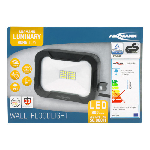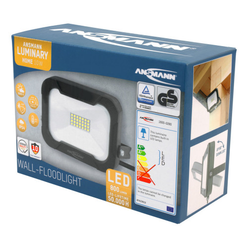 Robuuste en compacte ANSMANN Luminary BASE werklamp voor wandmontage met 10W SMD LED's en een lichtsterkte tot 800lm; stof- en spatwaterdicht dankzij IP54 (geschikt voor buitengebruik); aangenaam licht met een kleurtemperatuur van 5000K (daglicht); verticaal 190° verstelbare hoek van de spot; geïntegreerde H05RN-F kabel met een lengte van 20cm voor vaste en flexibele aansluiting met geringe mechanische belasting in droge, vochtige en natte ruimtes; 10 jaar garantie.