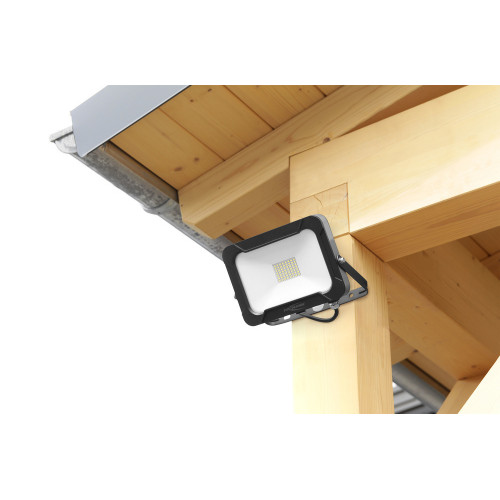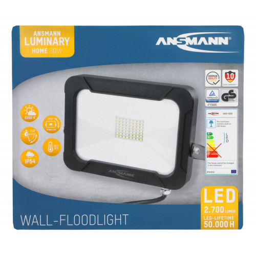 Robuuste en compacte ANSMANN Luminary BASE werklamp voor wandmontage met 30W SMD LED's en een lichtsterkte tot 2400lm; stof- en spatwaterdicht dankzij IP54 (geschikt voor buitengebruik); aangenaam licht met een kleurtemperatuur van 5000K (daglicht); verticaal 190° verstelbare hoek van de spot; geïntegreerde H05RN-F kabel met een lengte van 20cm voor vaste en flexibele aansluiting met geringe mechanische belasting in droge, vochtige en natte ruimtes; 10 jaar garantie.