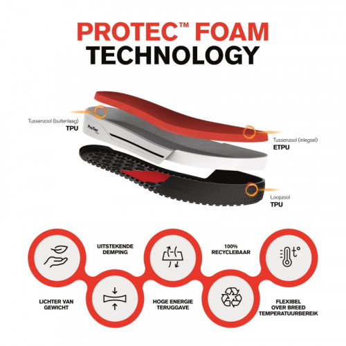 De nieuwe Redbrick zolen zijn gemaakt van het innovatieve ProTec™ Foam. De combinatie van slijtvast TPU op de loopzool en het gebruik van ETPU binnenin, maakt de zool dempend en licht van gewicht.