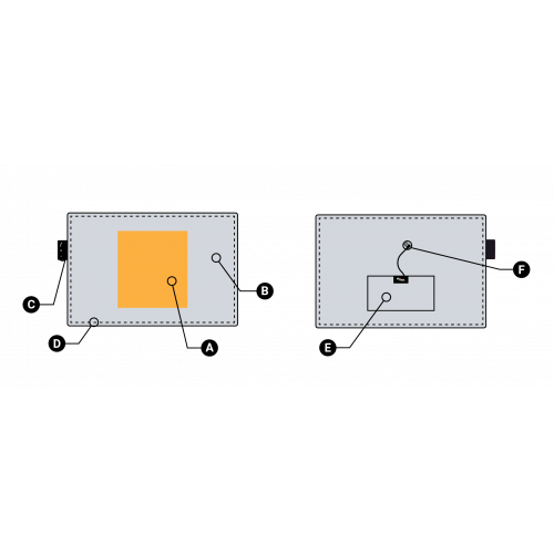 A. Verwarmingselement | B. Vulling | C. Bedieningspaneel | D. Vlindernaad | E. Batterijvakje | F. USB kabel