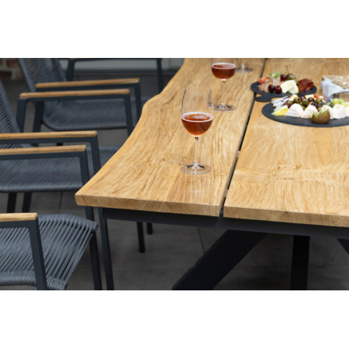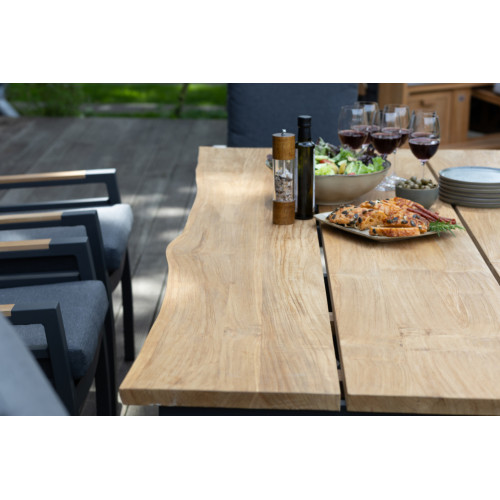 Deze stijlvolle teaktafel combineert een natuurlijke uitstraling met een twist. Het teakhouten blad heeft een prachtige boomstamkant, waardoor de tafel een uniek karakter krijgt. Het robuuste aluminium kruisonderstel zorgt voor een stoer en eigentijds design én biedt optimale stabiliteit.
