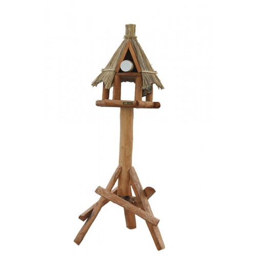 Een RH Voederhuis op standaard Bleke Sperwer riet om wilde vogels bij te voeren, voorzien van milieuvriendelijke transparante acrylbeits. Het dak is bedekt met riet.