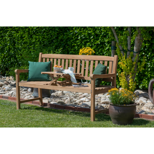 Met een zitbreedte van 150 cm biedt het tuinbankje voldoende ruimte voor ontspannende uren buiten. De geïntegreerde en uitklapbare tafels aan de zijkanten van de stoel zorgen voor extra comfort en functionaliteit. Hierdoor kun je drankjes, snacks of andere items handig opbergen en altijd bij de hand hebben.