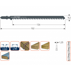 Uitvoering:HCS, Spitsvertand, vrijhoek- en tandgeslepen.Toepassing:Zacht hout, verlijmd hout, geplas..